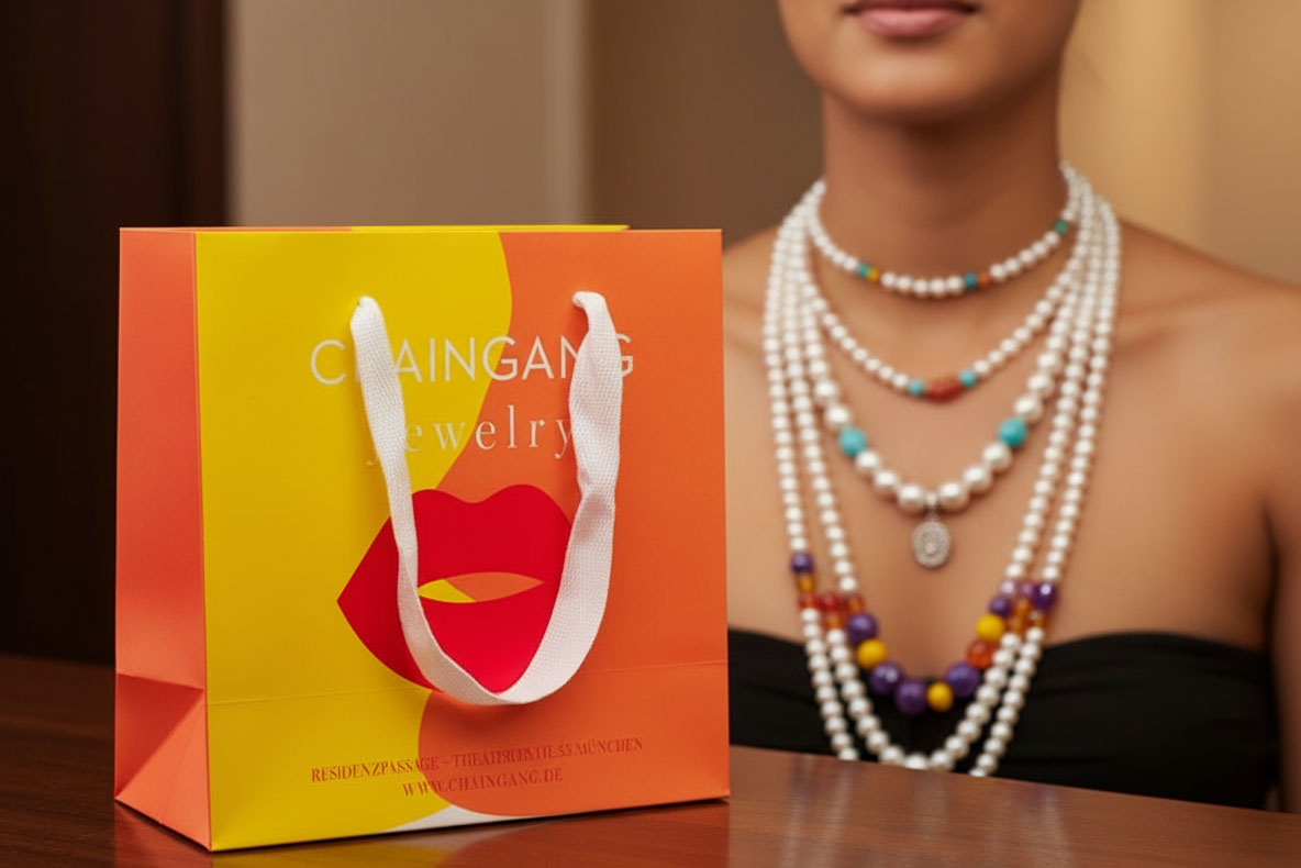 Individuelle bedruckte Papiertasche mit Baumwollband für exklusive Produkte. Nutzen Sie die Möglichkeit Papiertaschen ganz individuelle auf Ihre Produkte abzustimmen. So erreichen Sie Ihre Zielgruppe punktgenau ohne Streuverluste und gewinnen Sympathie. Dabei sind die Kosten für Tragetaschen überschaubar und auch für kleinere Boutiquen finanzierbar. Je nach Motiv und Stückzahl liegen die Kosten meist nicht mehr als bei 1,- €. Zusätzlich zu Baumwollbändern bieten wir noch Bänder aus Satin oder Fischgrätmuster in verschiedenen Farben an. Die Bänder können handgeknotet oder im Randumschlag verklebt werden.