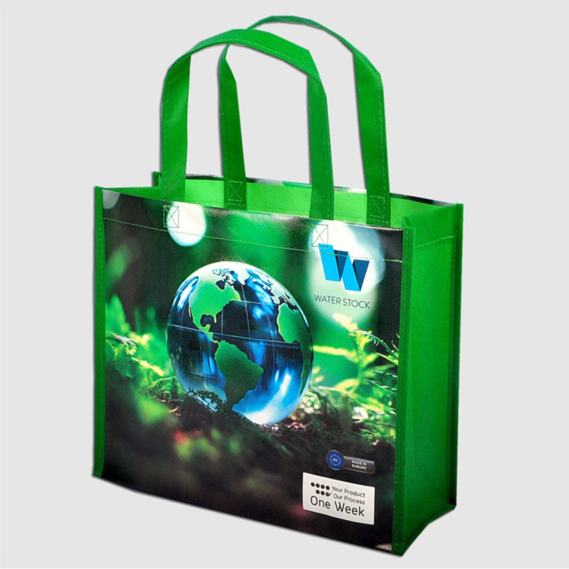 Diese Taschen sind mehrfach verwendbar und vollständig recycelbar. Da für die Produktion keine Fotopolymerplatte benötigt wird, bieten sie eine kostengünstige Lösung für kleine Auflagen – eine ideale Alternative zu traditionell im Flexodruck bedruckten Taschen.