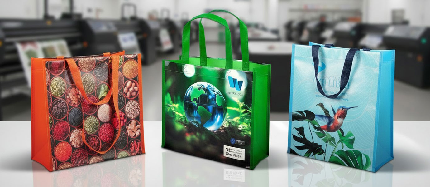 Diese Taschen sind mehrfach verwendbar und vollständig recycelbar. Da für die Produktion keine Fotopolymerplatte benötigt wird, bieten sie eine kostengünstige Lösung für kleine Auflagen – eine ideale Alternative zu traditionell im Flexodruck bedruckten Taschen.